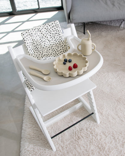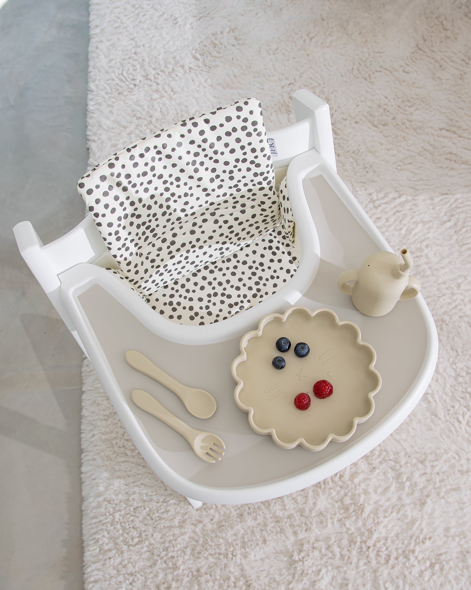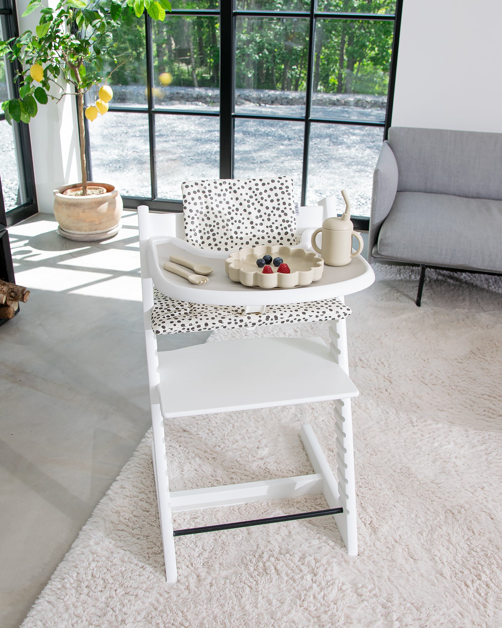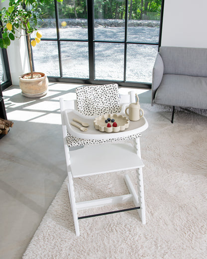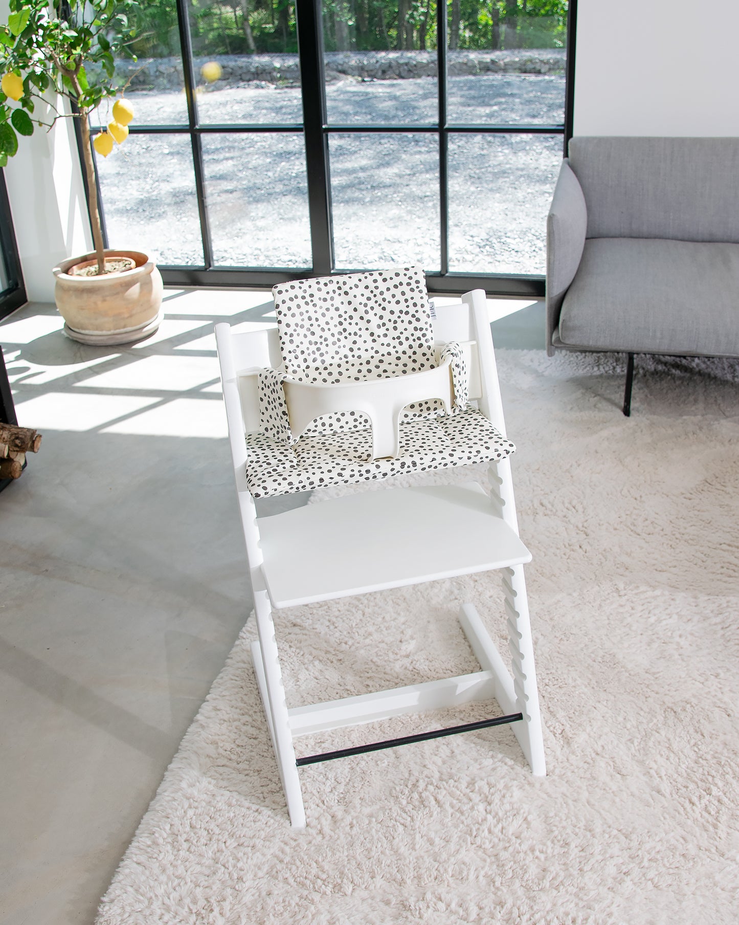 En hvid hynde med sorte miniprikker. Tilpasset til Stokke Tripp Trapp. Hynden kan bruges på Stokkes babyset og derefter direkte på stolen, når barnet bliver ældre. Hynden er blød og behagelig for den lille at sidde på/læne sig mod, samtidig med at den er nem at tørre af.