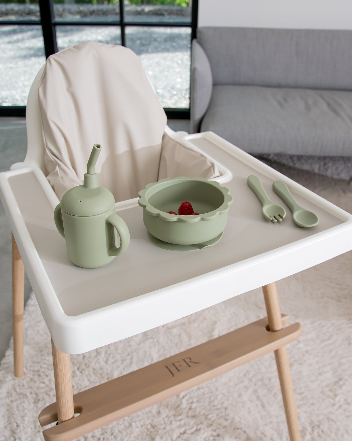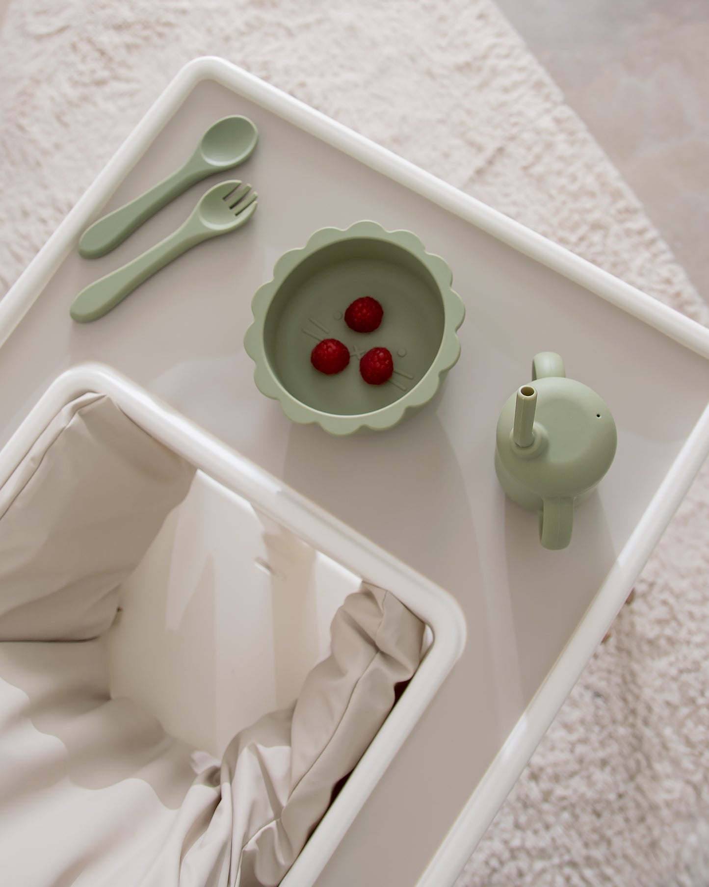 Til skålen findes matchende tilbehør som hagesmæk, bestik og krus.