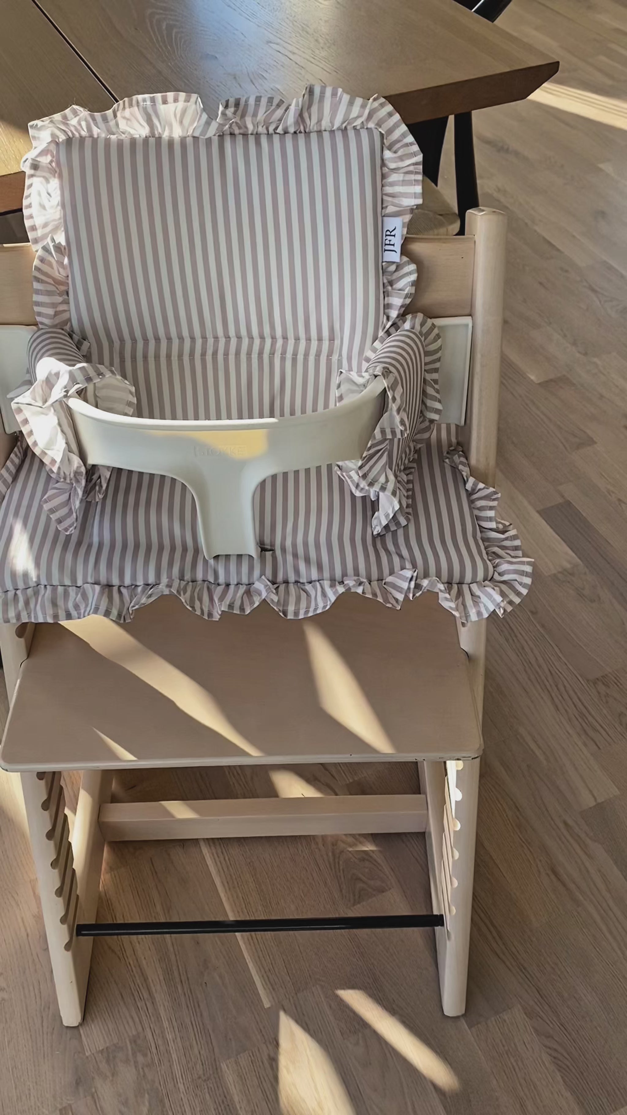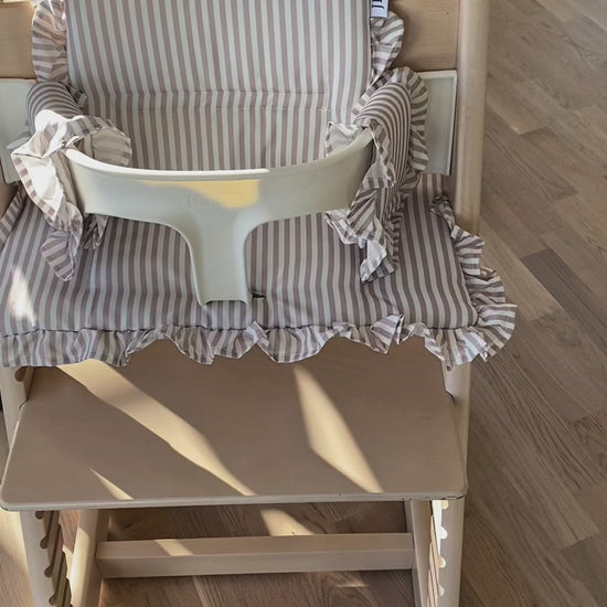 Ge din Tripp Trapp-stol en stilren och charmig makeover med vår mjuka sittdyna med volang i ett randigt beige mönster. Den här stolsdynan är ett enkelt och snyggt sätt att lyfta barnstolens utseende och skapa en harmonisk känsla som passar din heminredning.