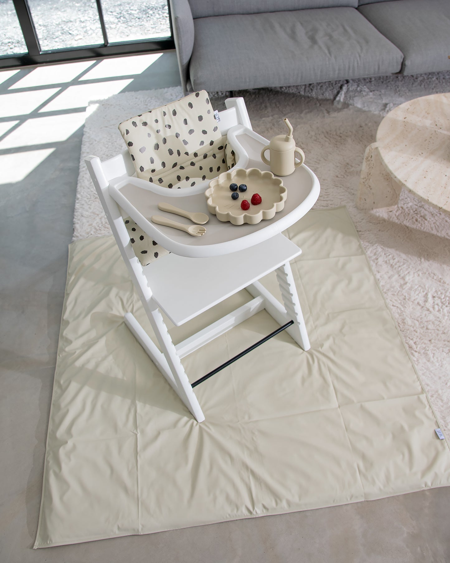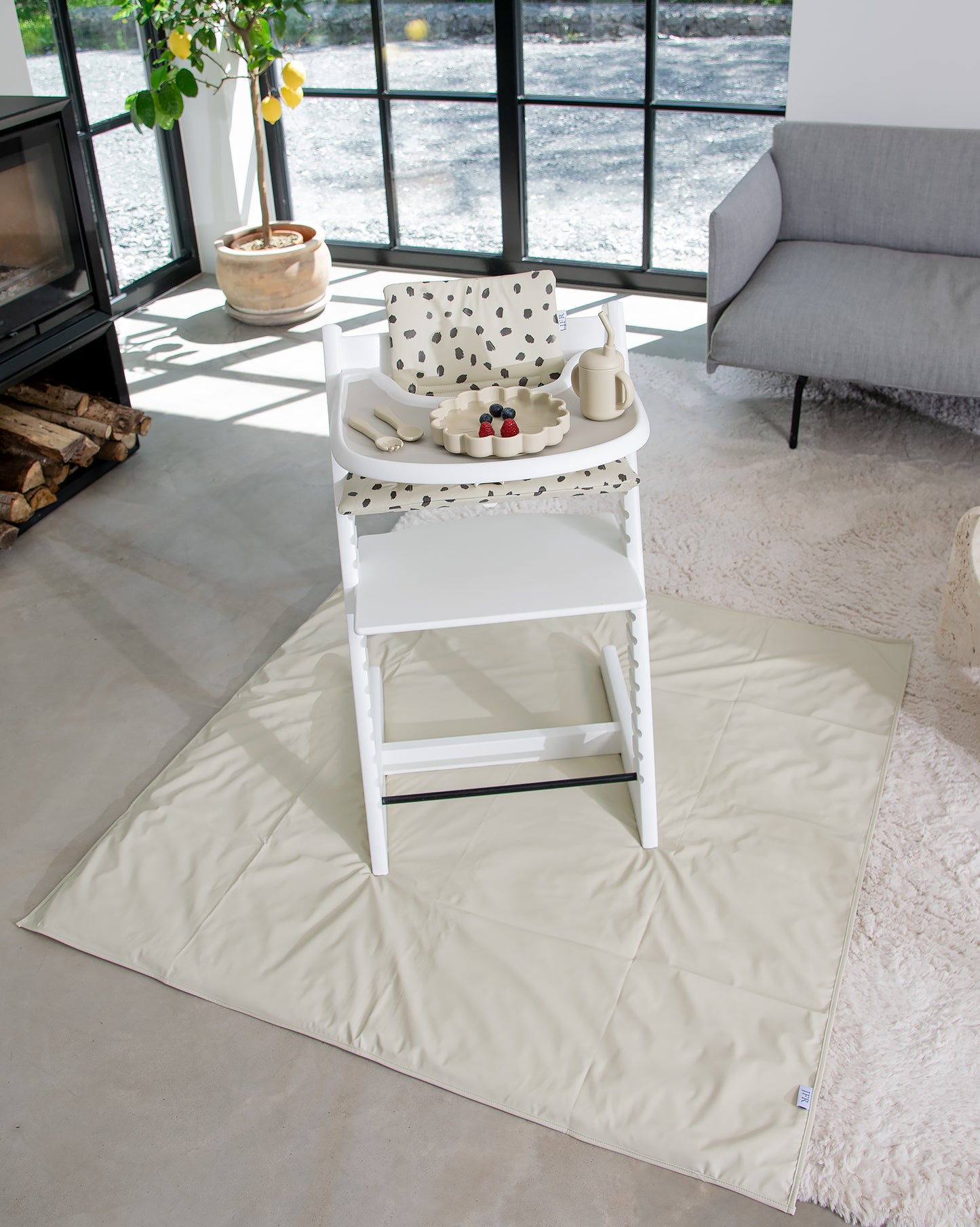 Protect your floors with our beautiful, practical floor mat. The mat is designed to go under the highchair for easier cleanup after meals, because you and I both know not everything ends up in your little one's tummy... The mat is wipeable and, if you wish, it can easily be machine washed. It also works great for picnics, crafts, or out on the patio to avoid splinters. Its uses are many.