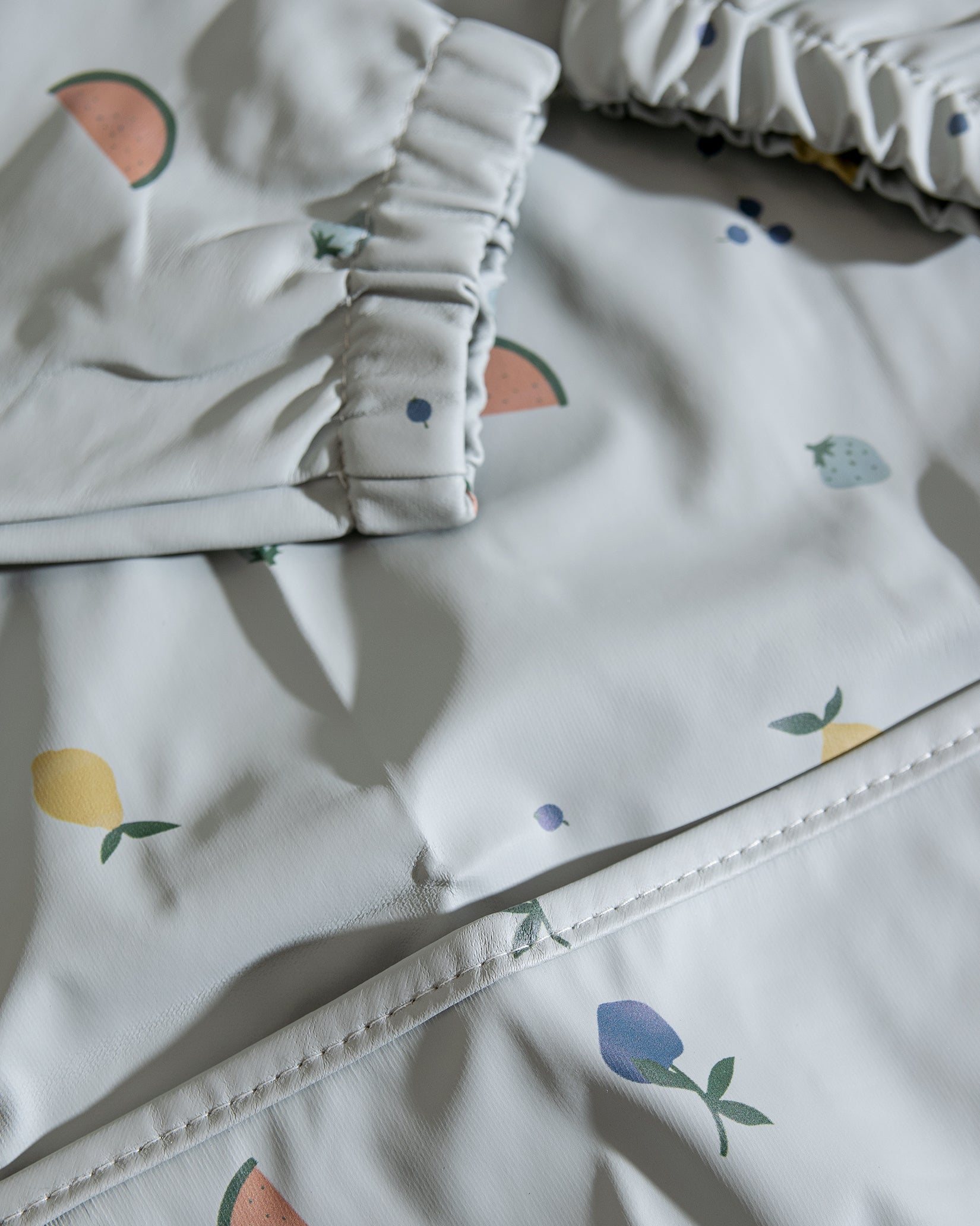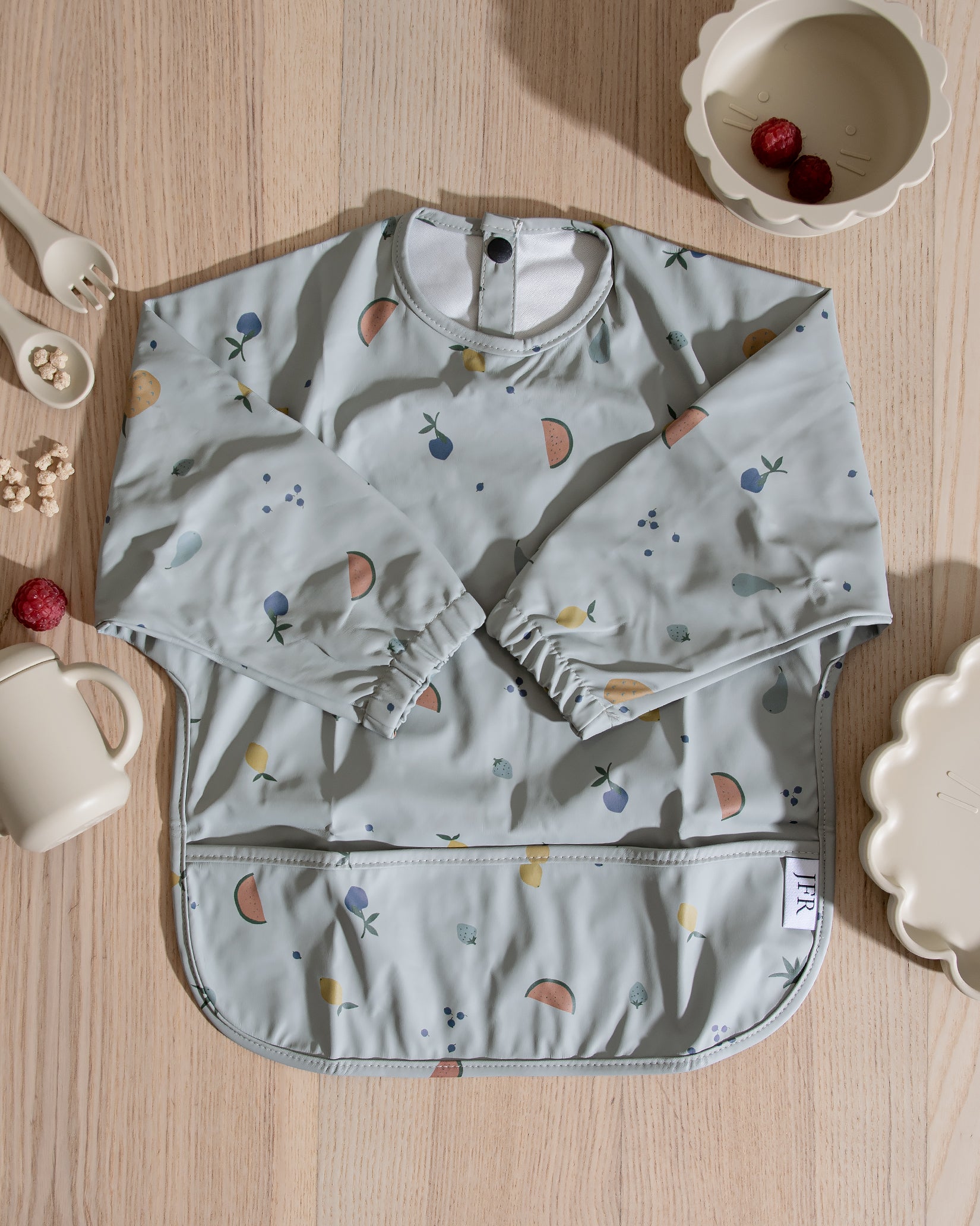 En nyttig, praktisk og avtørkbar smekke i blått med fruktig mønster. Smekken er vannavvisende og lekker ikke gjennom. Denne smekken er helt perfekt for å spise selv eller for hobbyaktiviteter. Veldig enkel å tørke av/rengjøre. Strikken i ermesluttene hindrer mat eller hobbyaktiviteter fra å komme inn under.