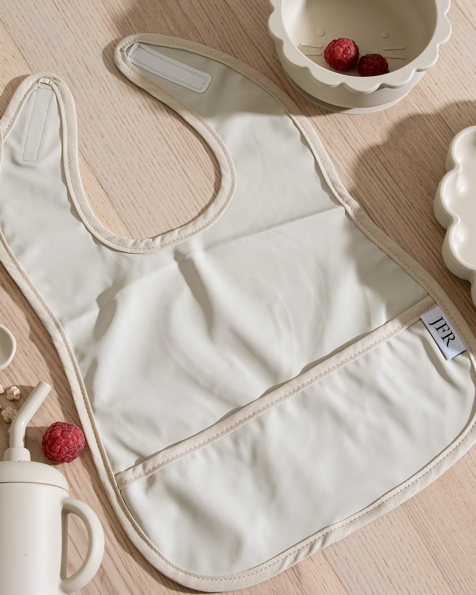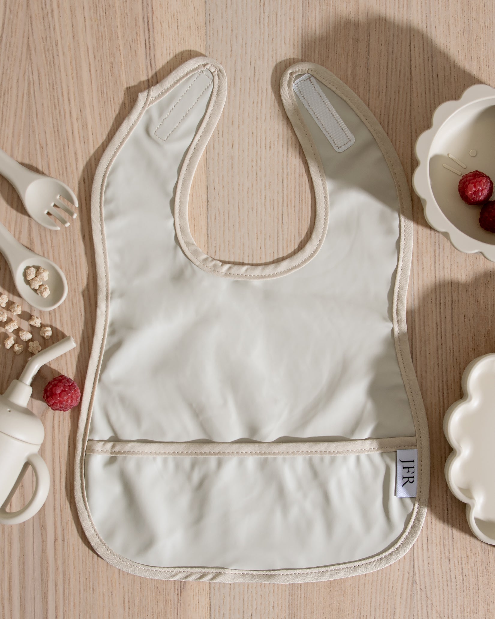 Vår avtorkbara och vattentäta haklapp är designad för att göra måltiderna enklare – både för barn och föräldrar. Med en smart uppsamlingsficka fångar haklappen effektivt upp makaroner, ärtor och allt annat gott som har en tendens att smita från tallriken.