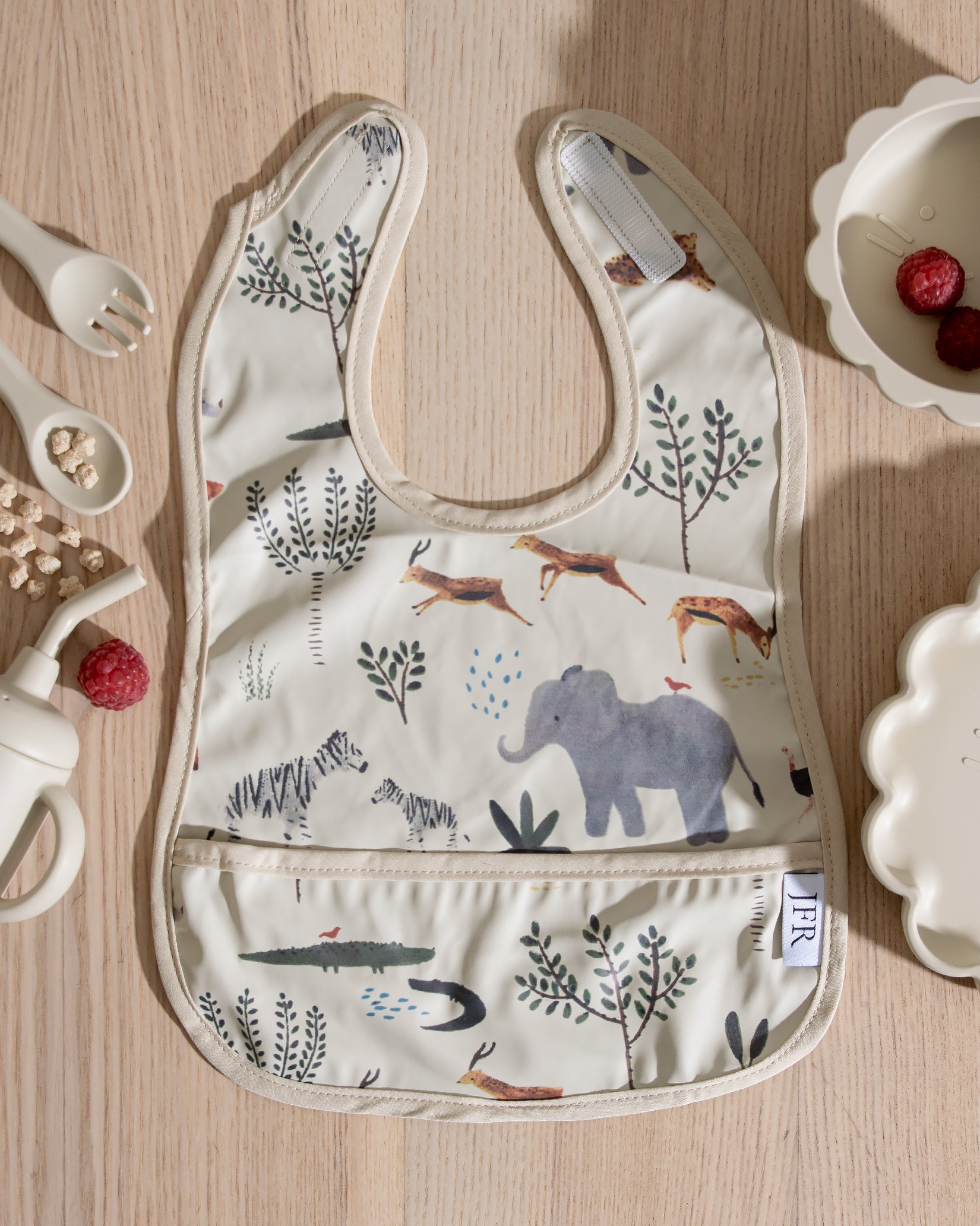 Vår avtorkbara och vattentäta haklapp är designad för att göra måltiderna enklare – både för barn och föräldrar. Med en smart uppsamlingsficka fångar haklappen effektivt upp makaroner, ärtor och allt annat gott som har en tendens att smita från tallriken.