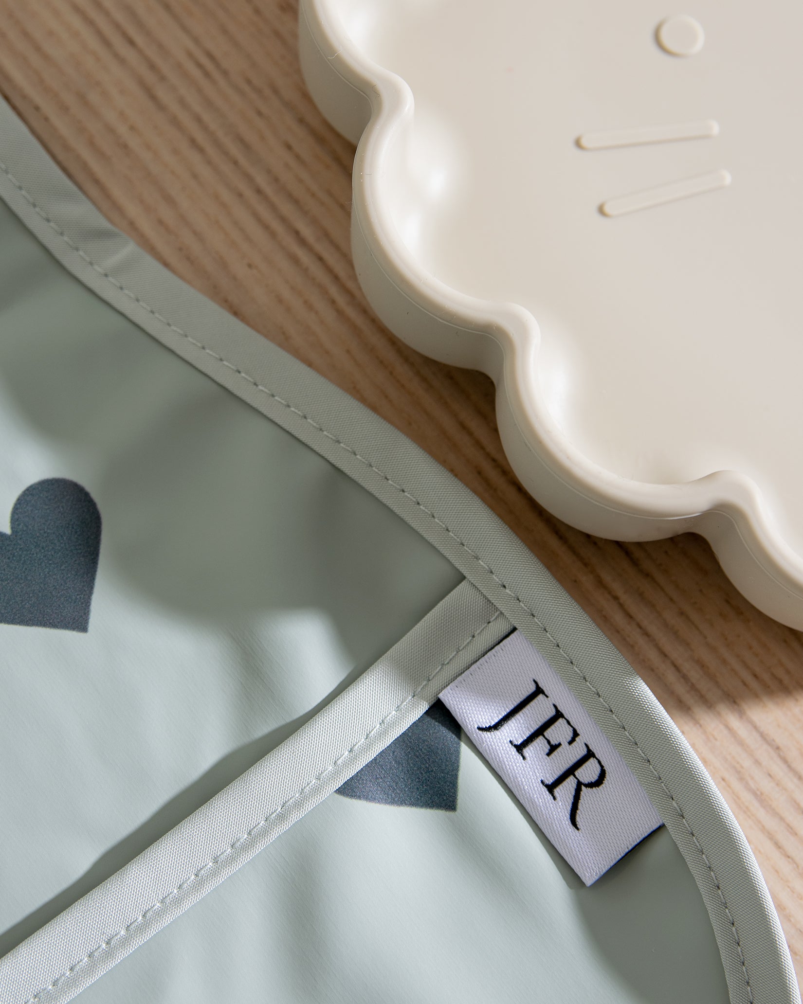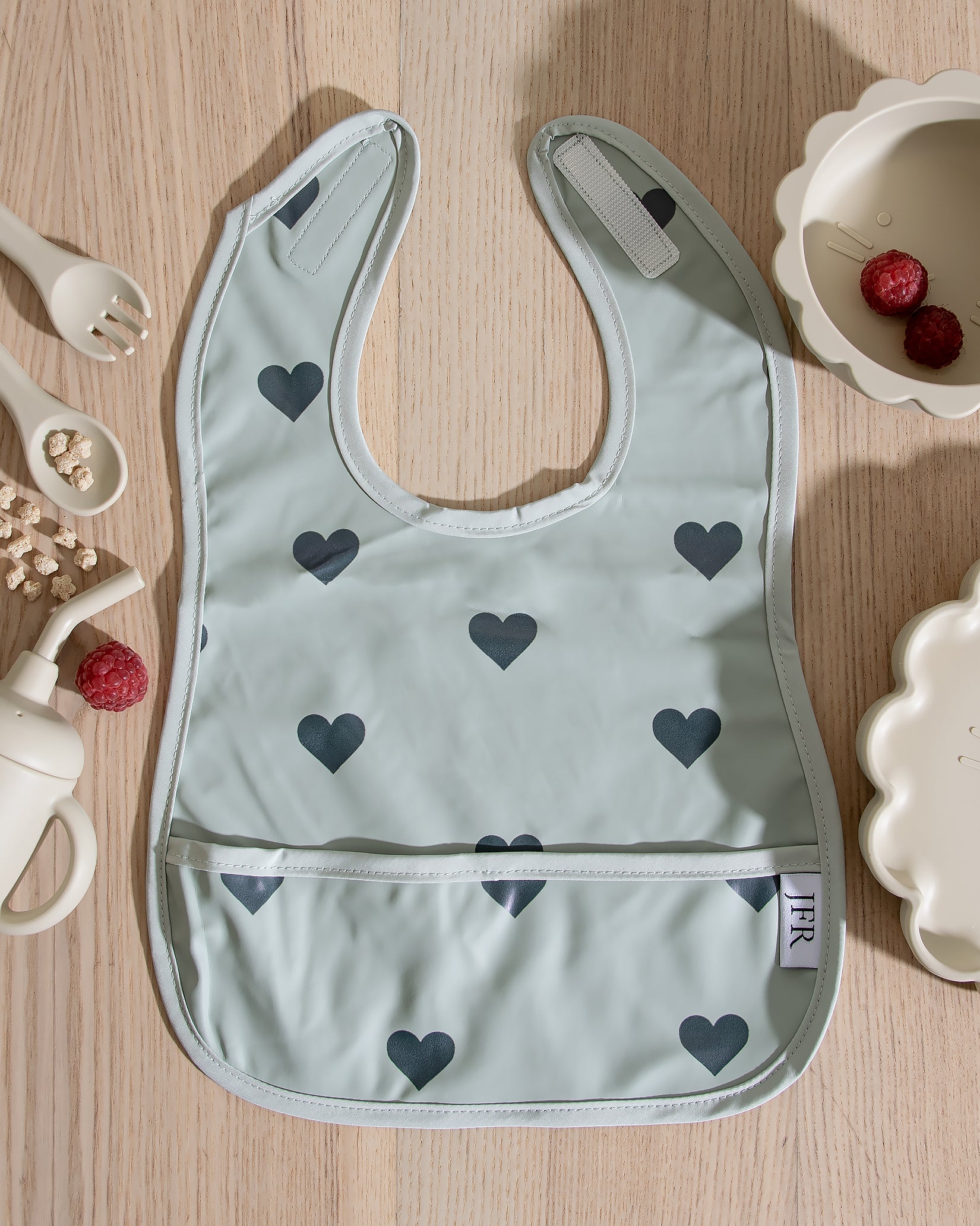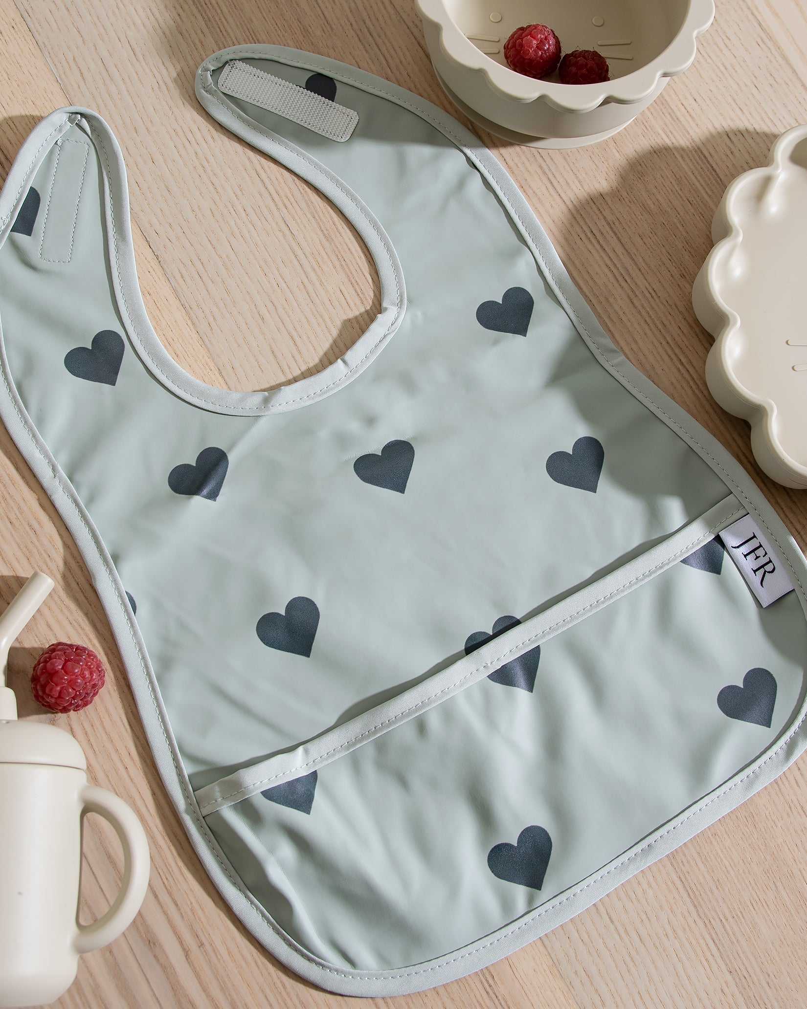 Vår avtorkbara och vattentäta haklapp är designad för att göra måltiderna enklare – både för barn och föräldrar. Med en smart uppsamlingsficka fångar haklappen effektivt upp makaroner, ärtor och allt annat gott som har en tendens att smita från tallriken.