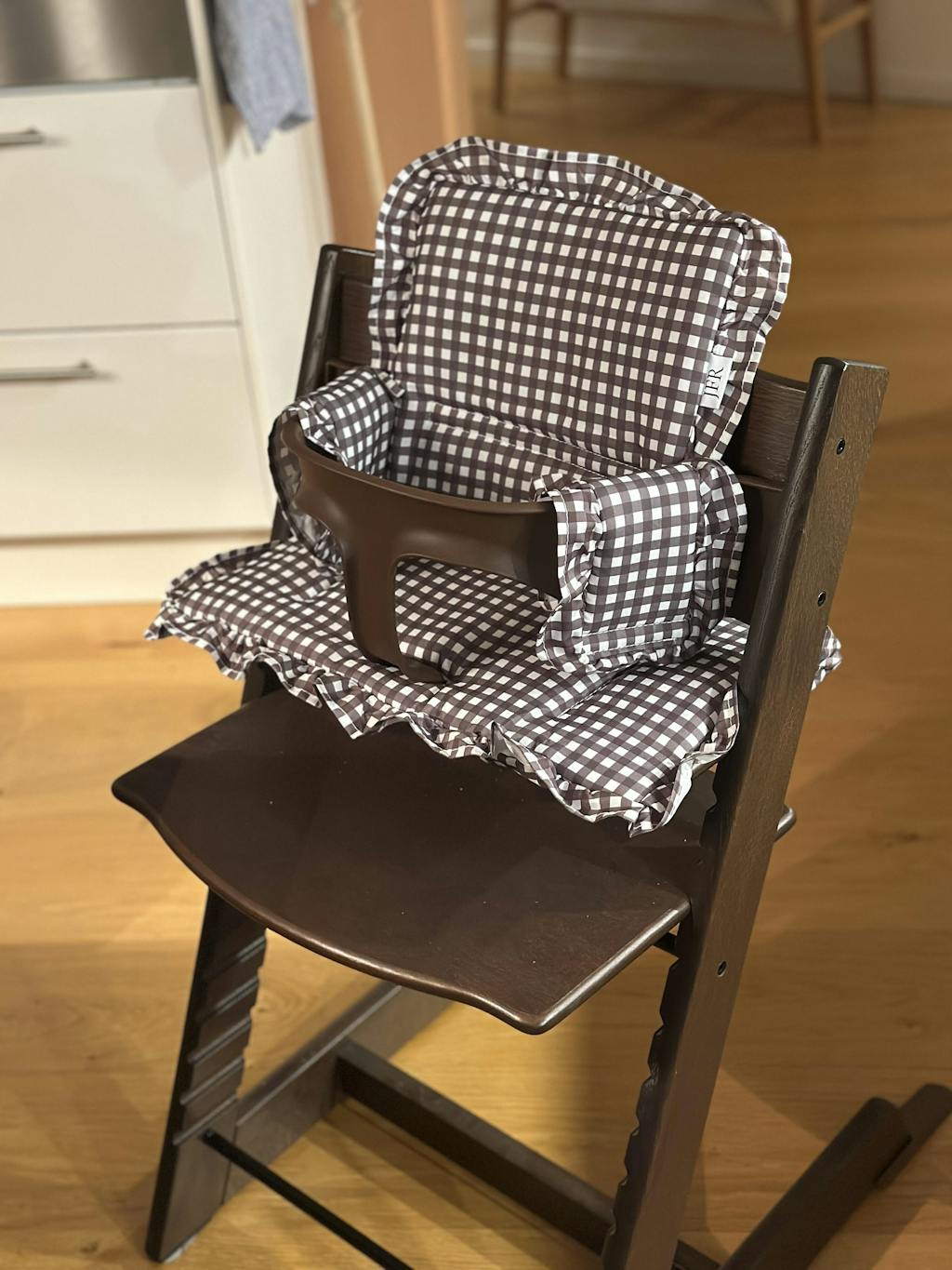 Ge din Tripp Trapp-stol en stilren och charmig makeover med vår mjuka sittdyna med volang i ett vackert rutigt brunt mönster. Den här stolsdynan är ett enkelt och snyggt sätt att lyfta barnstolens utseende och skapa en harmonisk känsla som passar din heminredning.