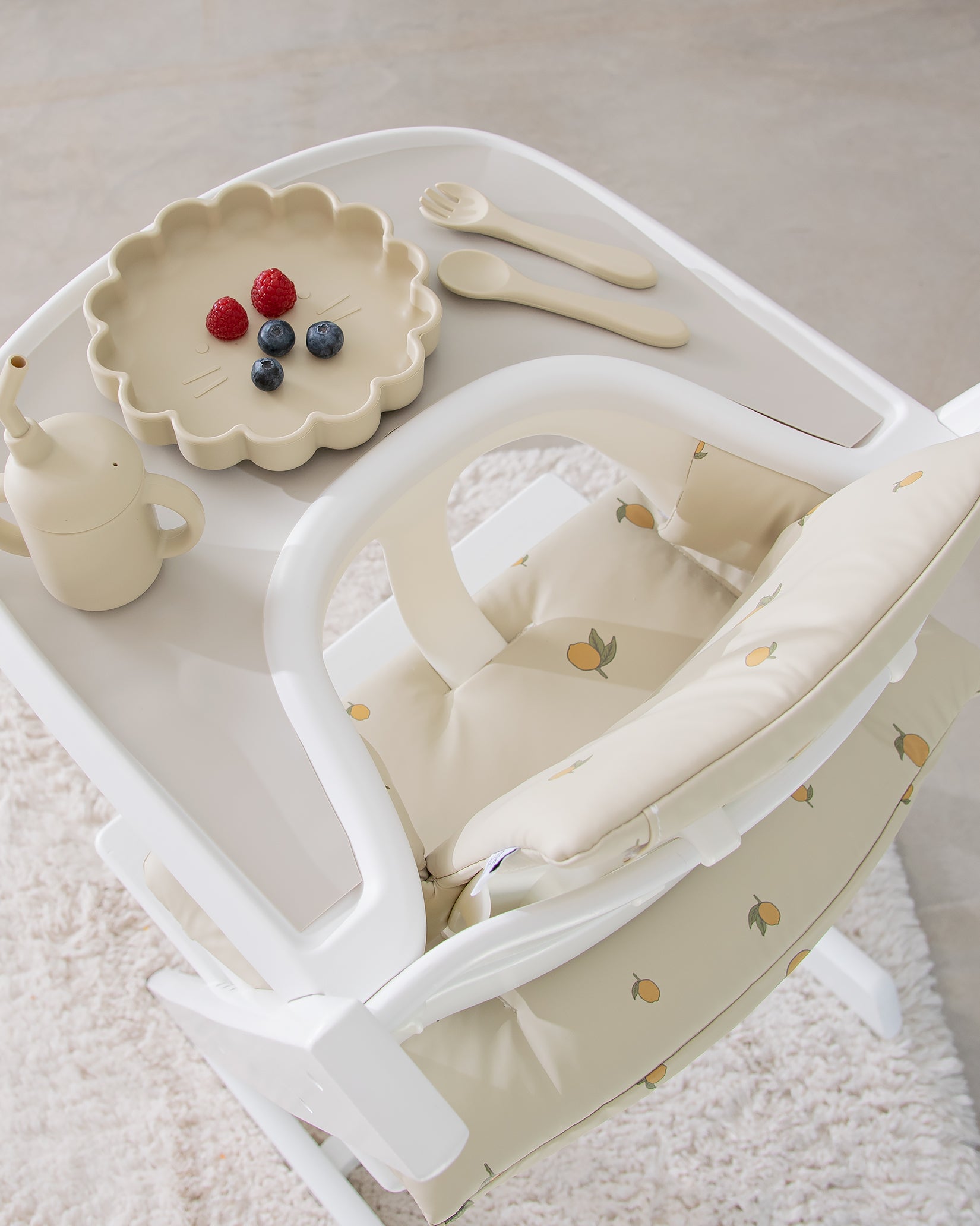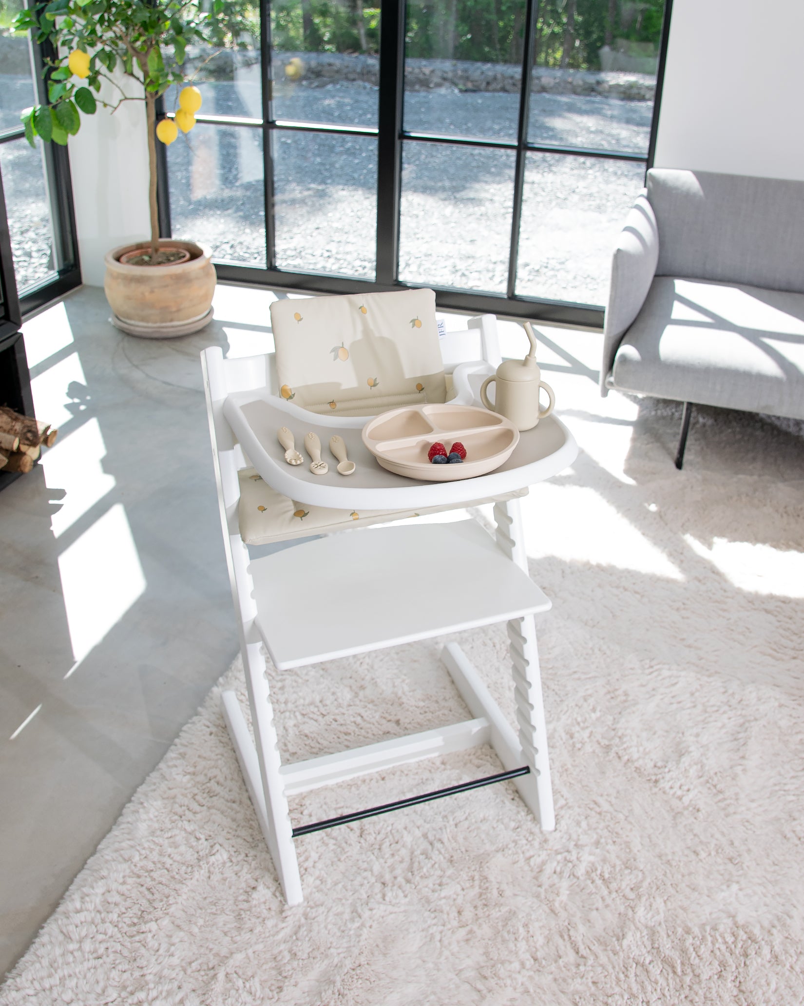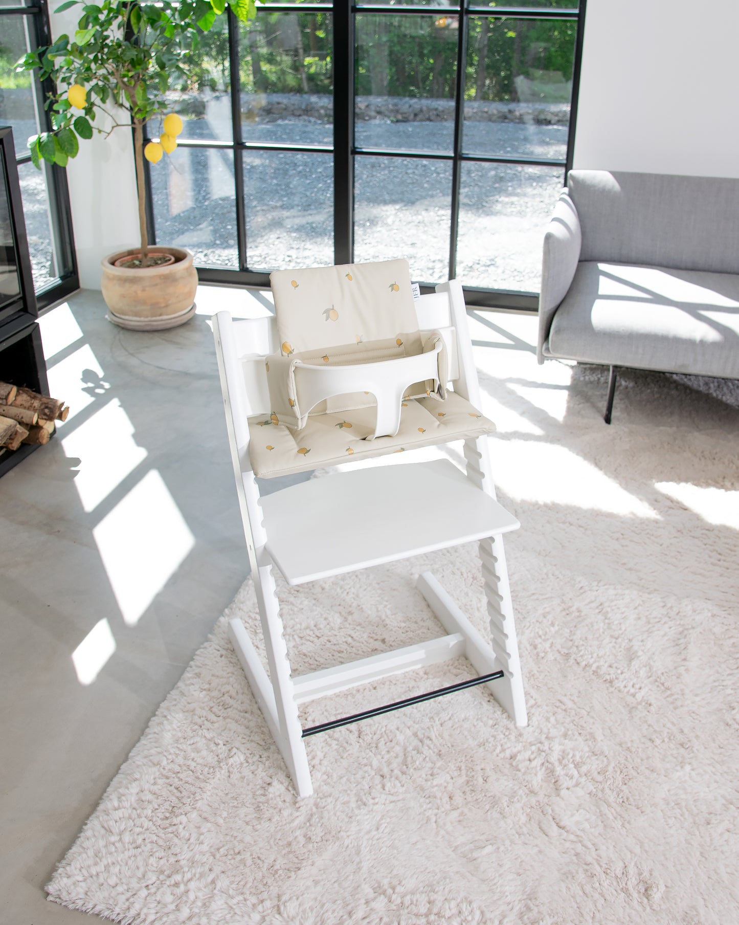 En beige dyna med citroner anpassad för Stokke Tripp Trapp. Dynan kan användas på Stokkes babyset och sedan direkt på stolen när barnet blir äldre. Dynan är mjuk och skön för den lilla att sitta på/luta sig mot samtidigt som den är enkel att torka av.