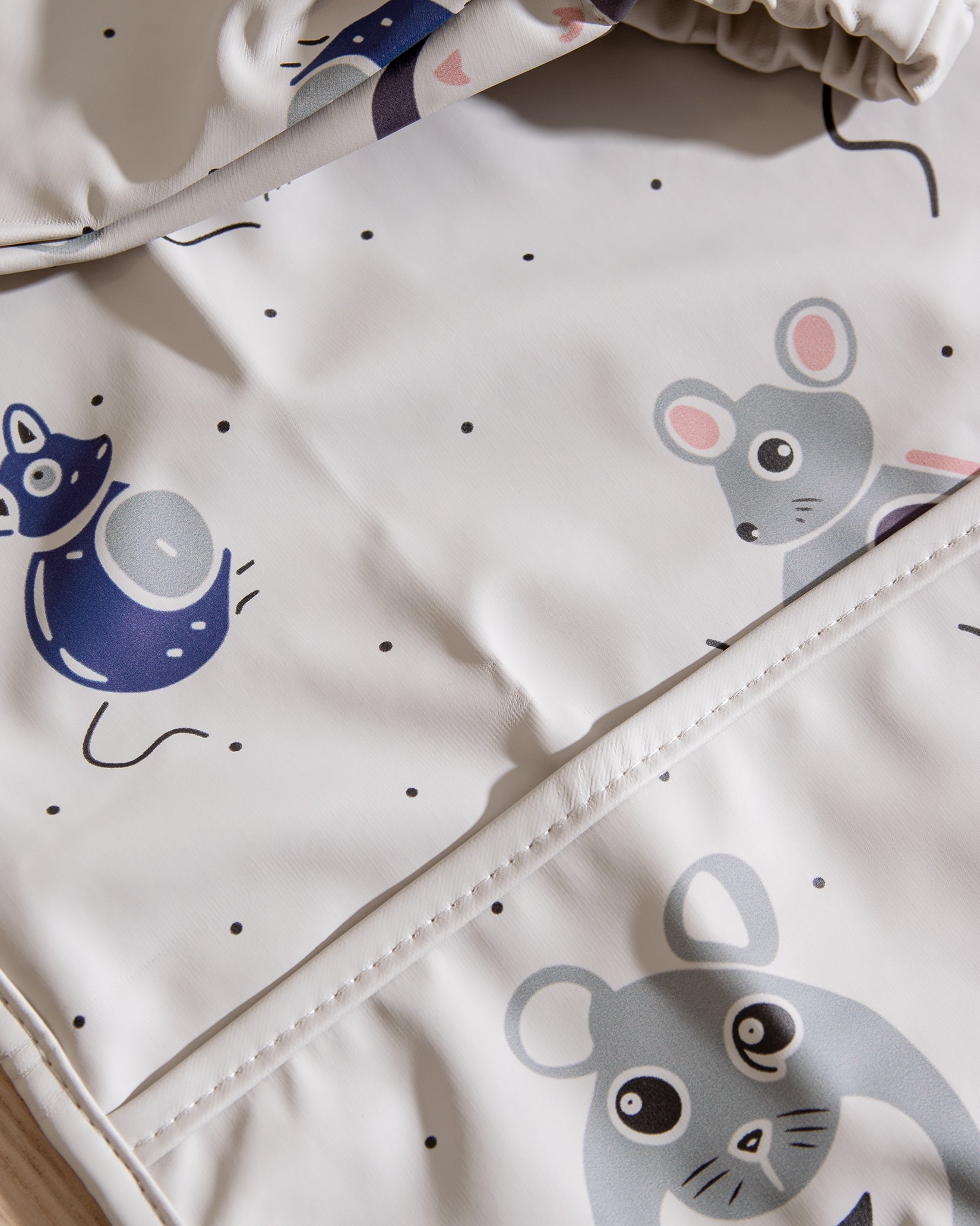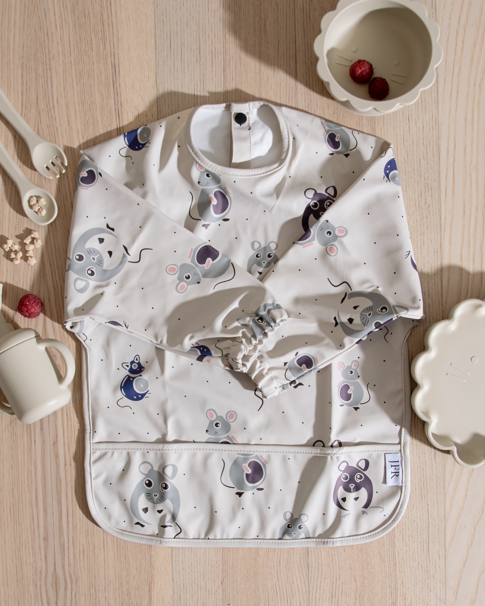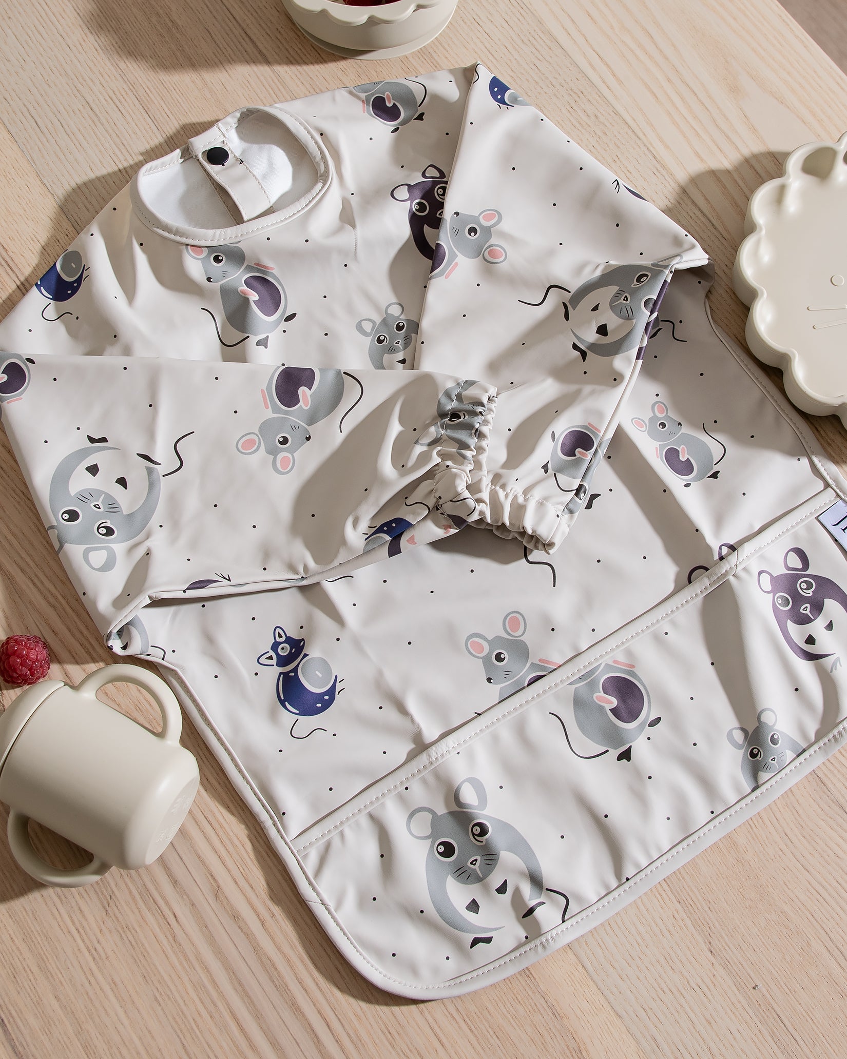 En användbar, praktisk och avtorkbar haklapp i beige med busiga små möss som mönster. Kanske perfekt för en busunge? Haklappen är vattenavvisande och läcker inte igenom. Denna haklapp är helt perfekt för att äta själv eller för pyssel. Väldigt enkel att torka av/rengöra. Resåren i ärmsluten hindrar mat eller pyssel att komma in under.