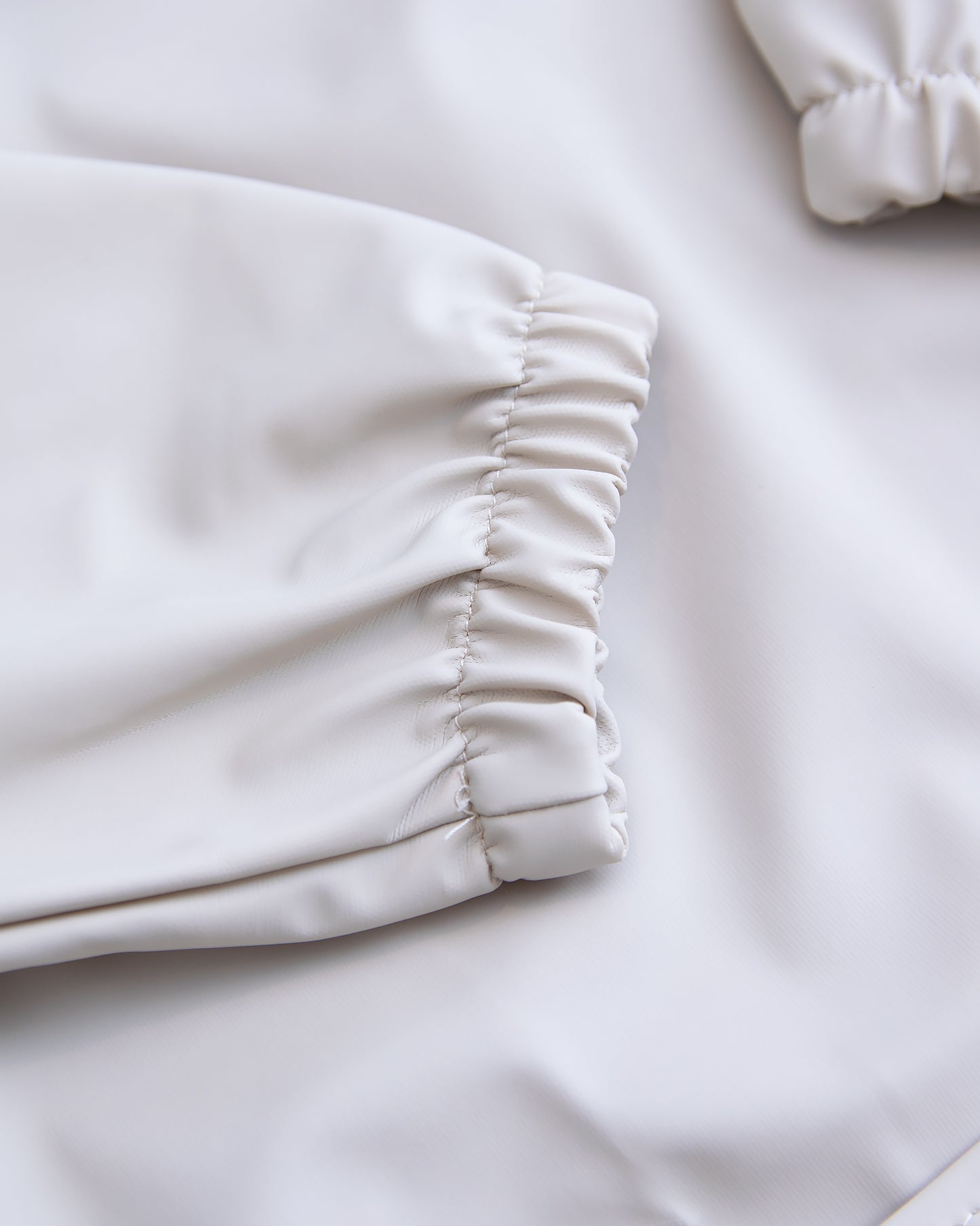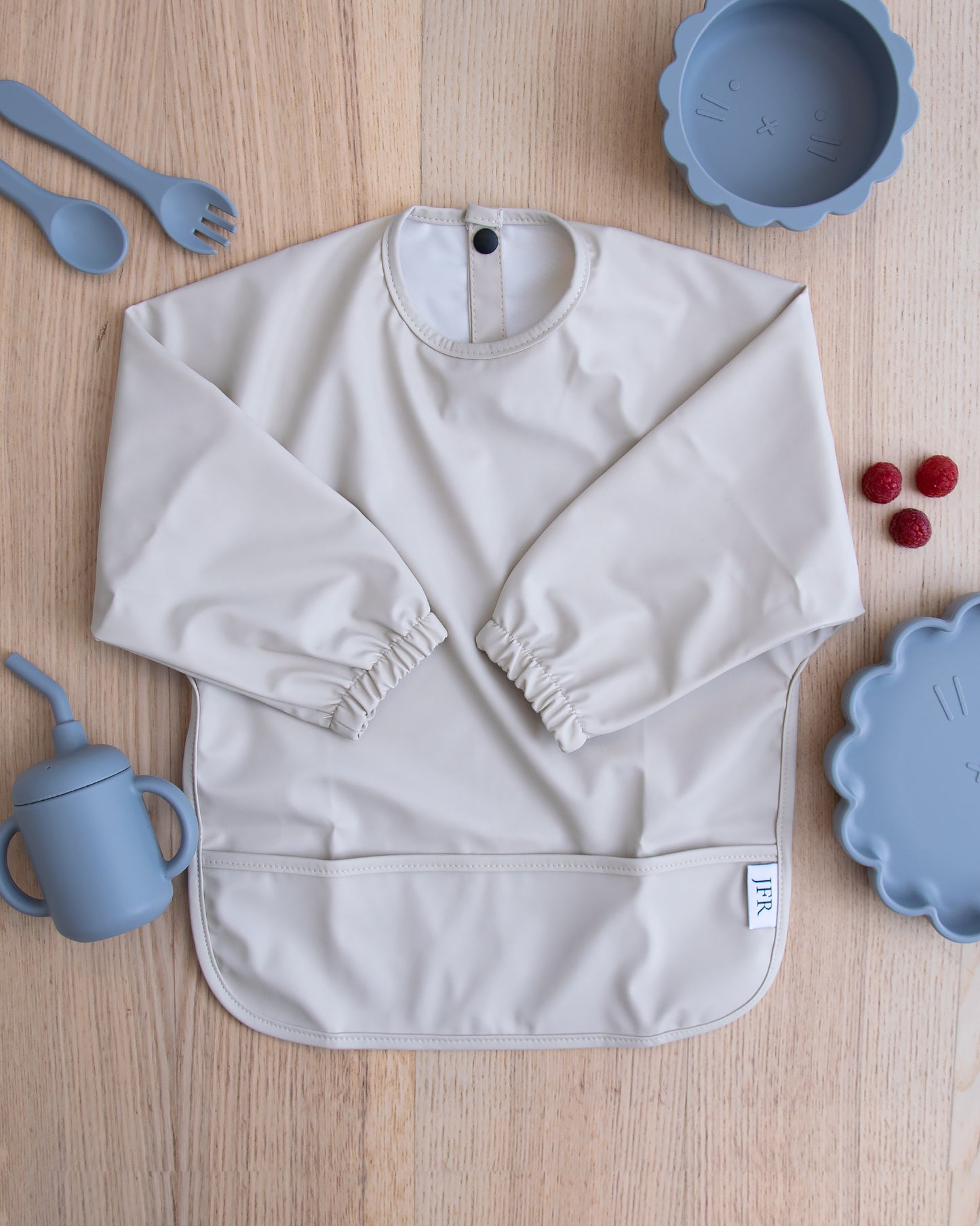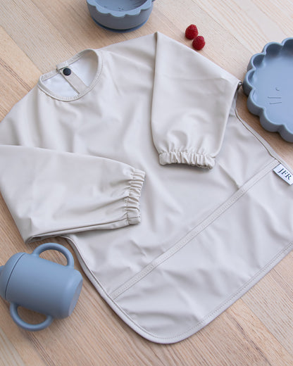 En mycket praktiskt och populär långärmad haklapp med mönster. Haklappen är vattenavvisande och läcker inte igenom. Denna haklapp är helt perfekt för att äta själv eller för pyssel. Väldigt enkel att torka av/rengöra. Resåren i ärmsluten hindrar mat eller pyssel att komma in under.