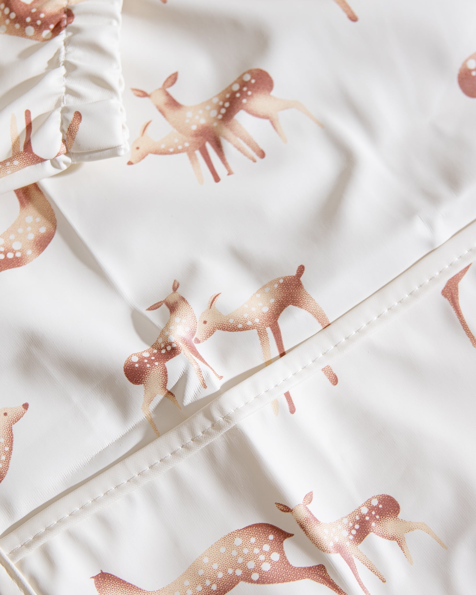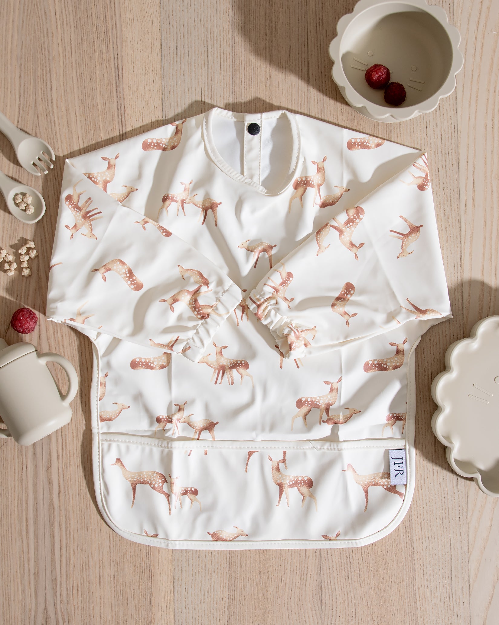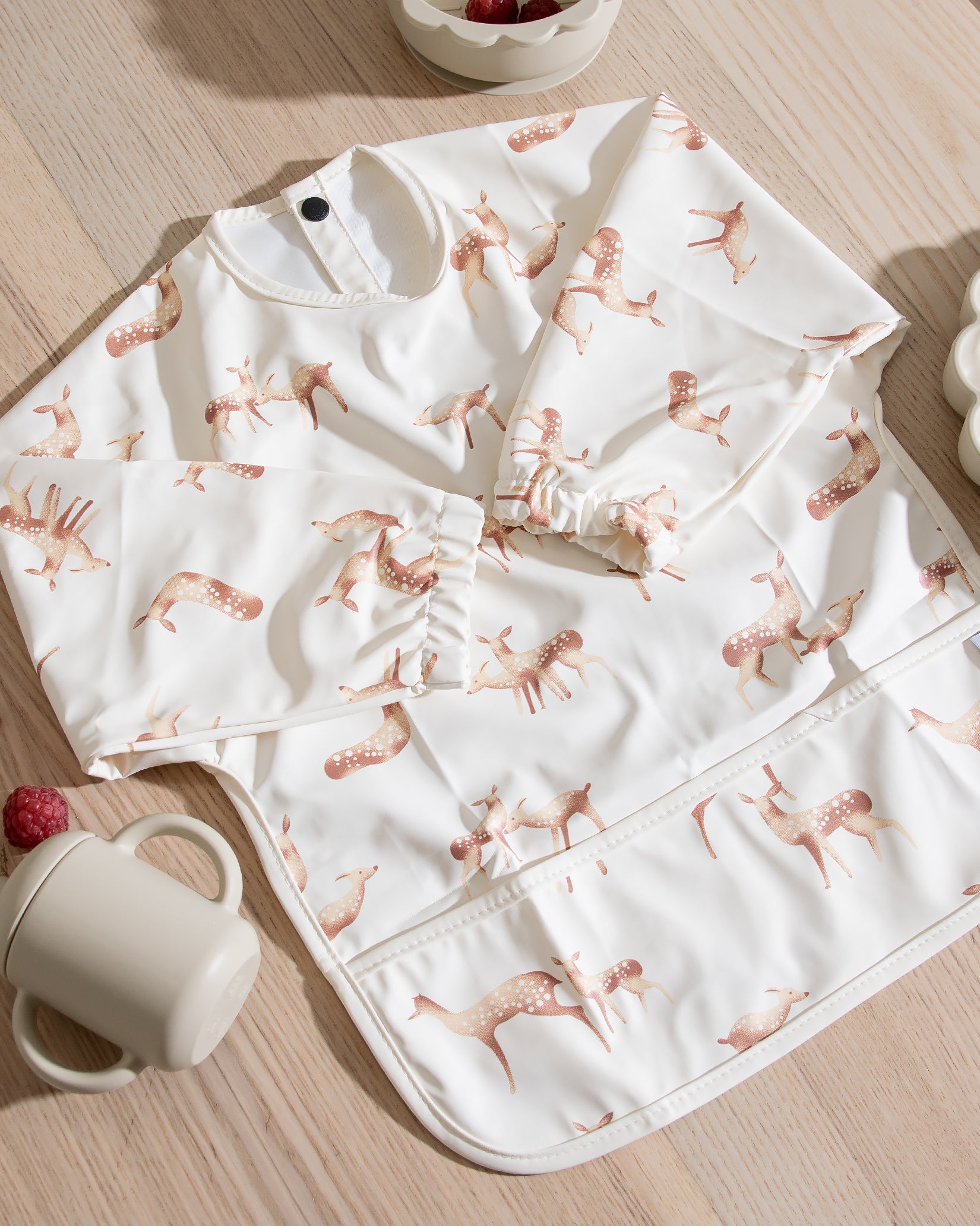 En användbar, praktisk och avtorkbar haklapp i beige med rådjur. Hur gulligt? Haklappen är vattenavvisande och läcker inte igenom. Denna haklapp är helt perfekt för att äta själv eller för pyssel. Väldigt enkel att torka av/rengöra. Resåren i ärmsluten hindrar mat eller pyssel att komma in under.